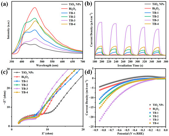 (a) Photoluminescence (PL) emission spectra. (b) Photocurrent response. (c) EIS Nyquist plots, (d) LSV curves of TiO2 NPs, Bi2O3, and TB-x (x = 1–4).
