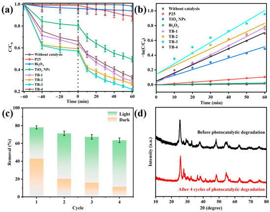 (a) Adsorption in the dark and photocatalytic degradation of TC under visible light irradiation by using the as-prepared samples and P25. (b) The fitting of the pseudo-first-order kinetic model. (c) Cyclic adsorption–photocatalytic degradation of TC over TB-3. (d) XRD patterns of TB-3 before and after four cycles.
