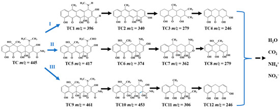 Intermediates and the possible photocatalytic degradation pathways for TC removal using TB-3.