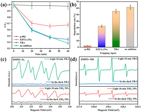 The electron spin resonance (ESR) spectra of DMPO-·O2− and DMPO-·OH are displayed in Figure 12c,d. The DMPO-·O2− and DMPO-·OH signals revealed that no ·O2− and ·OH were produced in the dark. However, characteristic peaks of DMPO-·O2− and DMPO-·OH were observed under visible light illumination, indicating that ·O2− and ·OH are active substances in the photocatalytic process. It is worth mentioning that the DMPO-·O2− and DMPO-·OH signals of TB-3 were significantly enhanced compared with those of the TiO2 NPs. This indicates that more ·O2− and ·OH radicals can be generated when using TB-3 instead of TiO2 NPs during photocatalysis.