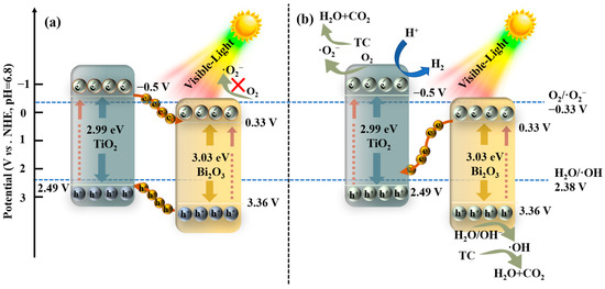 In contrast, a possible Z-scheme photocatalytic mechanism was proposed, as shown in Scheme 1b. Under visible light irradiation, the photogenerated electrons are excited from VB to CB in both Bi2O3 and the TiO2 NPs. The photoinduced electrons on the CB of Bi2O3 will quickly transfer to the VB of TiO2 to recombine with the holes, leaving the photogenerated electrons on the CB of the TiO2 NPs and the remaining holes on the VB of Bi2O3. Because the CB potential of TiO2 NPs (−0.5V vs. NHE) was more negative than the redox potential of O2/·O2− (−0.33 V vs. NHE) and H+/H2 (0 V vs. NHE), the electrons on the CB of TiO2 NPs could react with O2 and H+ to generate ·O2− and H2, which was evidenced by the active species trapping experiments and hydrogen evolution tests (Figure 10 and Figure 12). Meanwhile, the holes on the VB of Bi2O3 could react with H2O to produce ·OH radicals, as the VB potential of Bi2O3 was more positive than the redox potential of H2O/·OH (2.38 V vs. NHE). Moreover, the holes as active species also had a sufficient oxidation capability to directly decompose TC [6,50]. In this way, the photogenerated charge carriers with relatively stronger oxidation and reduction ability can be efficiently separated, and more ·O2− and ·OH active species can be produced to participate in photocatalytic degradation, as proven by ESR results (Figure 12c,d). Therefore, the above Z-scheme pathway of the charge transfer led to the significantly improved photocatalytic activity of TB-3.