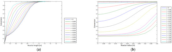 Graphical representation of the conversion profile of cyclohexanol to cyclohexanone: (a) conversion profile of cyclohexanol as a function of length for each placement point along the radius of the reactor, and (b) conversion profile of cyclohexane as a function of radius for each position longitudinal. Obtained from the data in Table A1.