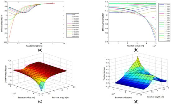 Figure 4a,b show the dependence of the effectiveness factor on the Thiele modulus and the radius and length of the reactor. In general, it can be mentioned that at 10 cm in length, the inflection points of the effectiveness factor occur since this depends on the Thiele modulus, and this in turn depends on the temperature. Figure 4c shows a trend similar to Figure 3d because both are related by .