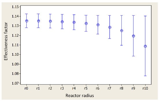 From the analysis of variance for the factor of effectiveness vs. radius, with a value p = 0.138 > 0.05, it is stated that there are no significant differences between the values of the effectiveness factor with respect to the radius (see Table 2). Figure 5 shows a progressive increase in the variation of the effectiveness factor with respect to the radius. However, the average value of this factor presents a decreasing distribution of r = 0 to r = R.