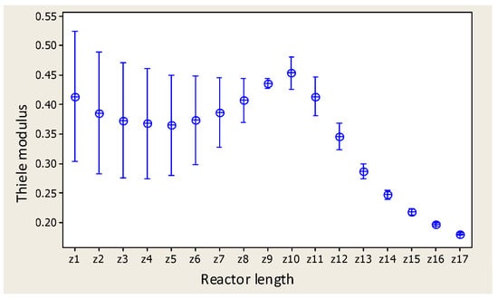 From the analysis of variance for the Thiele modulus vs. length, with a value p = 0.000 < 0.05 (see Table 5), it is stated that there are significant differences in the Thiele modulus with respect to the length of the reactor as observed in Figure 8, where the mean value distribution curve presents two stretches: The first stretch is from the reactor entry point to about 1 m, where the variation is greater at the entrance of the reactor and decreases rapidly until the indicated value of one meter. The second section has a less marked decreasing variability starting at z = 1 until the exit to the reactor.