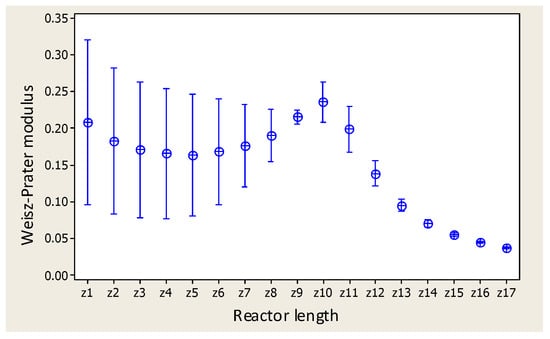 For a confidence level of 95%, there are significant differences in the values of the Weisz–Prater modulus with respect to length (see Table 7 and Figure 10). This is consistent with the significant differences found for the effectiveness factor and the Thiele modulus with respect to the length of the reactor.