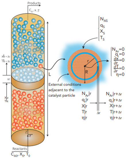 Consequently, the objective of the work is to obtain the radial and axial profiles of conversion and temperature in the catalytic bed, that is, the external conditions on the catalyst surface. With this knowledge, specific points (r, z) of the reactor are chosen, which correspond to the location of the catalyst particle, which allows obtaining for each selected particle both their respective conversion profiles, as well as the temperature inside the particle. Allowing in return to obtain the Thiele modulus, the effectiveness factor, and the Weisz–Prater modulus for each particle, with which it is possible to establish the profiles of these parameters as a function of radius and length. Likewise, the statistical analysis of the significance of the Thiele modulus, the effectiveness factor, and the Weisz–Prater modulus with respect to the radius and length of the reactor is made.