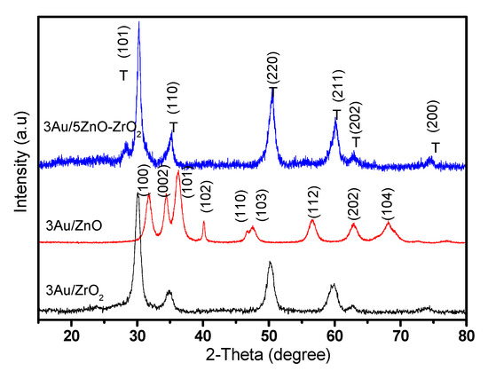 The X-ray diffraction technique (XRD) was used to identify crystalline phases in the 3Au/ZrO2, 3Au/ZnO, and 3Au/5ZnO−ZrO2 catalysts, as well as to obtain the mean crystallite sizes in the materials. Figure 1 displays the XRD patterns of the 3Au/ZrO2, 3Au/ZnO, and 3Au/5ZnO−ZrO2 catalysts. The XRD pattern of the prepared crystalline 3Au/ZnO is in accordance with the thermodynamically stable hexagonal wurtzite structure of ZnO (JCPDS card No. 36-1451). For 3Au/ZrO2, the peaks located at 2θ = 30.2°, 35.2°, 50.7°, 31.57°, 60.2°, 62.8°, and 74.5° correspond to the (1 1 0), (1 1 0), (2 2 0), (2 1 1), (2 0 2), and (2 0 0) crystal planes of the tetragonal structure of ZrO2 (JCPDS card No. 79-1769, with P42/nmc space group). The 3Au/5ZnO−ZrO2 catalysts show tetragonal crystalline structure, while for the hexagonal wurtzite structure of ZnO, no peaks are clearly detected. In addition, peaks located at 2θ = 30.2°, 35.2°, 50.7°, 31.57°, 60.2°, 62.8°, and 74.5° correspond to the (1 1 0), (1 1 0), (2 2 0), (2 1 1), (2 0 2), and (2 0 0) crystal planes of the tetragonal structure of ZrO2 (JCPDS card No. 79-1769, with P42/nmc space group). No peaks were observed for gold according to the JPDCS card No. 04-0784 due to its high dispersion in the three different ZnO, ZrO2, and ZnO−ZrO2 catalyst supports. On the other hand, in Figure 1, it is evidenced that although 5 wt. % of ZnO was incorporated into ZrO2, the crystallite size was not modified (Table 1); this fact was corroborated by the Scherrer equation. Table 1 shows that the surface area of the 3Au/5ZnO−ZrO2 sample increased to 157 m2/g with respect to 95, and 59 m2/g for the 3Au/ZrO2 and 3Au/ZnO samples, respectively. Therefore, this outcome revealed that the presence of ZnO on ZrO2 allowed improvement of the textural and structural properties of the material.