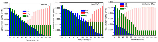 GC/MS profiles for the 3Au/ZrO2, 3Au/ZnO, and 3Au/5ZnO−ZrO2 catalysts in the CO oxidation from RT to 200 °C.