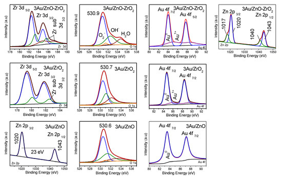 X-ray photoelectron spectroscopy (XPS) outcomes shown in Figure 6 display the Zr 3d spectra for the 3Au/ZrO2 and 3Au/5ZnO-ZrO2 catalysts thermally treated in air at 200 °C. Both catalysts displayed a doublet with a spin-orbit splitting of 2.4 eV corresponding to Zr 3d5/2 at ~182.2 eV [26]. The profiles of the 3Au/ZrO2 and 3Au/5ZnO−ZrO2 catalysts treated with air at 200 °C were quite similar; the main difference observed between the bimetallic catalysts and the monometallic one is the interaction and splitting related to zirconium sub-oxide species observed towards higher binding energies at 188 eV. In this sense, the displayed Zr 3d peak is very broad, indicating the occurrence of other Zr species. Moreover, the spectra indicate the existence of zirconium mainly as Zr4+ species on the 3Au/ZrO2 catalyst accompanied by a small proportion of sub-oxide Zr3+ (see Figure 5). In addition, the Zr 3d spectra for the 3Au/ZrO2 and 3Au/5ZnO−ZrO2 catalysts show two peaks ascribed to Zr 3d5/2 and Zr 3d3/2. In the spectra of the 3Au/5ZnO−ZrO2 catalyst, the peaks of Zr 3d5/2 ~183.63 and ~181.37 eV were fitted to Zr3+ and Zr4+ species, respectively, showing a spin-orbit splitting value of 2.3 eV. On the other hand, Figure 6 shows the XPS spectra for the Zn 2p region of the 3Au/ZnO and 3Au/5ZnO−ZrO2 catalysts, where double peaks are observed in the Zn 2p spectra, with main B.E. at 1043 and 1020 eV and spin-orbit coupling energy of 23 eV. The peaks are ascribed to Zn2p1/2 and Zn2p3/2 lines, respectively; the B.E. reveals two peaks from 1020 to 1023 eV and from 1040 to 1043 eV for the Zn2p3/2 and Zn2p1/2 lines, respectively, suggesting that Zn2+ on the surface was slightly modified after the addition of zinc to zirconium in the 3Au/5ZnO−ZrO2 catalyst [27]. Every peak is well fitted by the deconvolution with two peaks. In this way, the peaks at 1020 and 1043 eV are earmarked to zinc in tetrahedral sites in spinel lattices, and the peaks at 1017 and 1040 eV are allocated to zinc at octahedral sites in spinel lattices [28]. By the addition of Zn to Zr, the intensity of the Zn 2p spectra, assigned to octahedral sites in zinc spinel lattices, was increased. This fact shows that the wurtzite phase defects associated with octahedral zinc remained in the ZnO-ZrO2 mixed oxide; however, the concentration of octahedral zinc defects increased by the addition of Zn to zirconia crystals [3,29]. The Au 4f peaks at B.E values of ~83.9 and ~84.4 eV are associated with Au0 species. A typical Au 4f spectrum for the 3Au/ZrO2, 3Au/ZnO, and 3Au/5ZnO−ZrO2 catalysts is shown in Figure 6. The curve fitting of the Au 4f spectra is mainly carried out with the spin-orbit splitting value of 3.7 eV [30]. The Au 4f curve fitting of the 3Au/ZrO2, 3Au/ZnO, and 3Au/5ZnO−ZrO2 catalysts is shown in Figure 6. It is observed that two Au 4f7/2 components at B.E. of 84.5 and 85.8 eV are related to Au0 and Au1 species, respectively. Outcomes revealed the presence of Au1+ species, whose relative concentration is shown in Table 2. Au0 species are present in the 3Au/ZrO2, 3Au/ZnO, and 3Au/5ZnO−ZrO2 catalysts as nanoparticles (2–3 nm), which were not detected by X-ray diffraction. Moreover, the deconvolution for oxygen 1s of the 3Au/ZrO2, 3Au/ZnO, and 3Au/5ZnO−ZrO2 catalysts mainly shows three and four peaks, while the one at ~530.1 eV is due to lattice oxygen on ZrO2, the one at ~ 531.1 eV is attributed to OH groups, and the one at ~532.5 eV is assigned to the presence of H2O [31]. Moreover, the additional peak at ~531.5 eV is related to metal-bound oxygen, which was observed in all the catalysts.