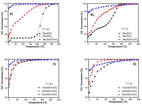 Temperature profiles and performance displayed by the tested catalysts: (A,B) comparison of CO conversions as functions of the reaction temperature for the 3Au/ZrO2, 3Au/ZnO, and 3Au/5ZnO−ZrO2 catalysts, GHSV of 46,000 h−1, treated under air or H2 atmosphere at 200 °C; comparison of CO conversions for the 1Au/5ZnO−ZrO2, 2Au/5ZnO−ZrO2, and 3Au/5ZnO−ZrO2 catalysts with different gold loadings (1, 2, and 3 wt. %) using thermal treatments under air (C) or hydrogen (D) atmosphere at 200 °C and GHSV of 46,000 h−1.