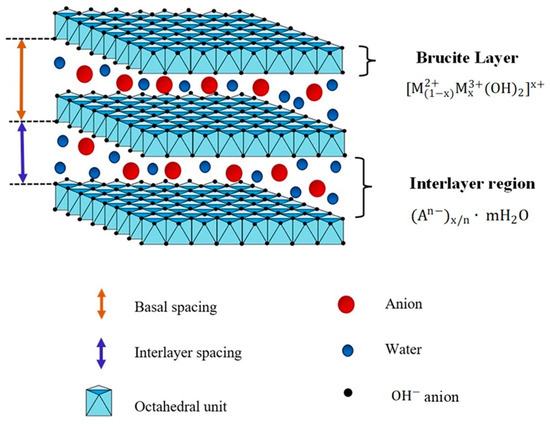 The general chemical composition of the LDHs is [M2+(1−x) M3+(x) (OH)2]x+ (An−)x/n. mH2O, where M2+ and M3+ are divalent and trivalent ions with a positive charge; An− represents the ions with a negative charge, and they are placed in an intercalated arrangement between the brucite layers (positively charged); x is the charge density of the layer [M3+/(M2+ + M3+)], which is approximately 0.2–0.33; finally m is the number of water molecules in the interlaminar region plus the anions present in this area. Figure 1 shows a typical structural scheme for hydrotalcite materials.