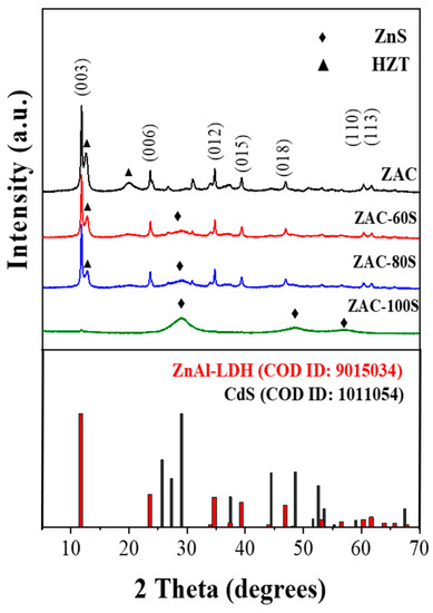 The presence of sulfur in the samples ZAC-60S and ZAC-80S was confirmed by the broad diffraction signal exhibited at 29° of 2 Theta; this matches the plane (111) of zinc sulfide (COD ID: 1100043), which is labeled as ZnS (♦). For the sample ZAC-100S, a complete change in the material’s structure was observed; the obtained diffractogram suggests that most of the Zn2+ cations reacted with sulfur to get ZnS in a high percentage. Nevertheless, the plane (003) remains visible with a weak signal at 11° of 2 Theta, confirming the presence of the ZnAl-LDH material in a minor percentage.