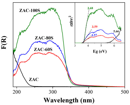 Figure 3 shows DRS spectra for the synthesized materials. As can be observed, the bare sample ZAC showed an absorption edge at 190 nm. On the other hand, for the sulfured samples ZAC-60S, ZAC-80S, and ZAC-100S, it was observed that a higher intensity of reflectance and the absorption edges shifted at higher wavelengths (~310 nm). This behavior suggests that the sulfured materials have a stronger light absorption.