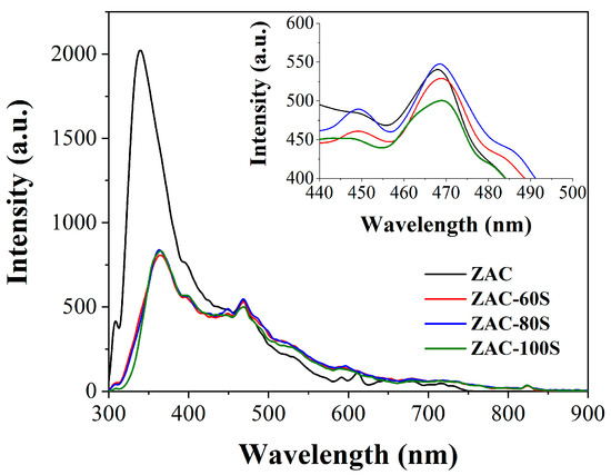 Figure 5 shows the photoluminescence spectra; they were recorded for an excitation wavelength of 299 nm. As can be seen, the sample ZAC exhibited the highest photoluminescence intensity, indicating the high electron/hole rate recombination. The absorption bands observed at 469 nm correspond to vacancy formation. The scale modification in the XY-axes showed that the sample ZAC-100S has the slowest rate of electron-hole recombination; this is attributed to a high percentage of vacancies in the material, which can improve photocatalytic performance [20].