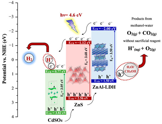 For the composite system in Figure 11, the photonic absorption is carried out by each compound’s most strongly bonded electrons (e.g., K energy shell) because those zones have a high electron concentration. In addition, it is essential to mention that photonic absorption is favored in atoms with a large atomic number [26]. So, it is expected that CdSO4 has more photogenerated electrons and holes. However, it is not entirely true; the presence of heterojunctions type II origins the transference of holes [27]. The vacancies (h+) in CdSO4 will be occupied by lower energy electrons present in the valence band of ZnS. Consecutively, the holes in ZnS will be occupied by lower energy electrons in ZnAl-LDH. This does not happen for ZnAl-LDH, since other lower energy electrons do not easily compensate for the electronic deficit. Thus, the presence of the holes in ZnAl-LDH is higher than in CdSO4. The accumulation of electrons in CdSO4 and holes in ZnAl-LDH takes place. Water splitting and photocatalytic reforming have been studied and discussed well. The mechanism for each is summarized below [28,29].