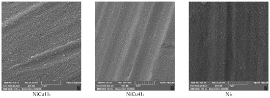 The SEM images of the bare mesh and meshes with deposited Ni-Cu oxide layers are shown in Figure 1. The appearance of the particles was similar in all cases: the oxides form analogous clusters of spherical particles, which differ in size. The NiCu14s and NiCu41s catalysts showed the smallest clusters, while the single-component Cus catalyst showed the largest clusters. This finding is understandable, as CuO has the lowest melting temperature (1326 °C); therefore, during calcination at 500 °C, sintering and enlargement of particles may occur. Nickel oxide melts at higher temperature (1955 °C) and, thus, enlargement of the particles may not be so significant.