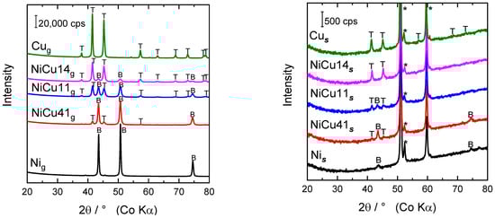 Powder XRD patterns of granular (left) and sputtered (right) Ni-Cu oxide catalysts; B–NiO (bunsenite), T—CuO (tenorite), *—stainless steel support.
