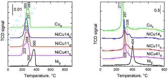 The reduction properties of the catalysts were investigated using H2-temperature programmed reduction. The reduction profiles of the granular and sputtered catalysts are shown in Figure 3. Numerous studies of Ni-Cu mixed oxides reduction using the H2-TPR method were already reported. For example, Fedorov et al. [12], Srivastava et al. [4], and Paryjczak [16] found that reduction profiles of CuO and NiO represent a single peak, and that the temperature of the reduction onset (Tonset) is lower than the reduction temperature of NiO. Based on their experimental data, Srivastava et al. [4] revealed a synergistic effect between copper and nickel oxides, as Tonset of the mixed oxide occurred at a lower temperature than in the case of pure oxides. Yen et al. [5] found that the TPR profiles of bulk CuO and NiO exhibited Tonset at 250 and 270 °C and the maximum reduction rates (reduction peak maxima) for both oxides occurred at 300 and 350 °C, respectively. This finding confirmed the easier reduction of CuO in comparison with NiO. The lower Tonset (approximately 40 °C) of the Cu0.5Ni0.5 mixed oxide compared to both CuO and NiO oxides indicated the presence of an intimate interaction between the metals, which increased the reducibility of both Cu and Ni oxide species.