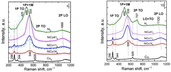 The Raman spectrum of granular Nig catalyst is shown in Figure 4. The spectrum showed only a broad peak at 488 cm−1 accompanied by a shoulder at 425 cm−1. These peaks correspond to one-phonon (TO∼450 cm−1) and one-magnon (1M) scattering excited simultaneously. The TO and LO peaks of the first-order phonons are absent, indicating a small proportion of crystal defects. The other two possible peaks at about 710 and 850 cm−1, which are attributed to 2TO and LO + TO modes, were negligible. The most intense Raman peak of granular Cug catalyst was observed at 296 cm−1; this was accompanied by peaks at 344 and 628 cm−1. In the literature [27], bulk CuO showed a Raman peak at 295 cm−1 and two peaks at 343 cm−1 and 629 cm−1. The authors observed a distinct shift to lower wavenumbers with a broadening effect for CuO nanomaterials prepared hydrothermally. Similar peaks were observed in the Raman spectrum of electrodeposited CuO layer [28]. The authors [29,30,31] found the peaks between 109 and 619 cm−1 corresponding to copper oxide such as Cu2O (109, 140 and 214 cm−1) and CuO (290, 339 and 619 cm−1). Spectra of granular Ni-Cu catalysts slightly changed with the increasing content of Ni in the catalysts; the intensity of the strongest CuO peak at 296 cm−1 decreased with decreasing Cu content in the catalysts. The Raman spectra of the Ni-Cu catalysts showed a superposition of the individual oxide peaks depending on the different contents of nickel and copper cations in the catalysts (Figure 4). A shift in the position of the Raman peak found for NiO at 488 to 535 cm−1 and in the position of the peak of CuO cannot clearly prove the formation of a mixed oxide, as the Raman peaks’ positions depend on the shape and size of crystallites [24].
