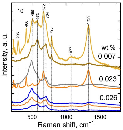 The Raman spectra of the sputtered catalysts are shown in Figure 4. The spectra are generally similar to those observed for the granular catalysts. The only exception is the spectrum of the sputtered Nis catalyst. To uncover the cause of this behavior, samples with various amounts of nickel oxide were prepared and measured at two or three different places of the sample surface (Figure 5). Their Raman spectra showed different peaks depending on the amount of NiO deposited. The low amount of NiO in the sample (0.007 wt.%) manifested itself in very broad peak, spreading out from approximately 400 to 800 cm−1 and centered around 570 cm−1. The peak included several smaller features at about 500, 570, 672, and 704 cm−1, indicating the presence of TO + LO modes. The second most visible peak, appearing at 1329 cm−1, was attributed to two magnon (2M) excitation. The increase in the peak’s intensity indicated larger crystallites of NiO [25]. A great difference in the intensity of the peak in three different places of measurement indicated heterogeneity of particles deposited by plasma jet sputtering. When the amount of NiO in the sample increased to 0.026 wt.%, the differences observed in the spectra decreased and became negligible. The Raman spectra of sputtered Ni-Cus and Cus catalysts (Figure 4) showed very similar patterns to those found for the granular catalysts, except for the presence of a band at ca. 707 cm−1. Similar to the granular catalysts, increasing amount of NiO in the catalysts led to the formation of a main peak with a maximum between 550 and 538 cm−1. The Nis catalyst showed similar bands to the granular Nig catalyst, but a new peak appeared at 707 cm−1 and the 2P LO peak at 1100 cm−1 disappeared. In contrast, the intensity of the peaks typical for CuO decreased with increasing NiO amount in the catalyst. Compared to granular catalysts, the catalysts prepared by plasma jet sputtering exhibit a partially different structure manifested by the presence of the band at 707 cm−1.