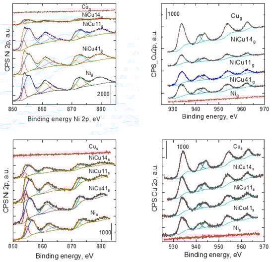 Deconvolution of the spectra of Ni 2p of granular catalysts (Figure 6, top left) and sputtered catalysts (Figure 6, top right) showed that there is no difference among the spectra (except for intensity) and that they all correspond to NiO. The structure of Ni 2p3/2, which is fitted by two nearby peaks and a satellite contribution (formed by two peaks, one of which is dominant), confirms the presence of NiO. The determined NiO position, 853.7eV, is consistent with the data reported in the literature [32]. The observed position of the most intense Cu 2p3/2 line corresponds best to the position of CuO, which is given as 933.6–933.8 eV. The structure of the satellite peaks observed at 940 and 943 eV confirms the presence of CuO. The oxidation state of copper is the same for all catalysts and does not change with a change in catalyst composition for both granular (Figure 6, bottom left) and sputtered catalysts (Figure 6, bottom right).