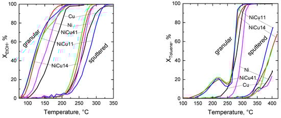 The light-off curves of ethanol and toluene oxidation over granular and sputtered catalysts are shown in Figure 7. The T50 values for the oxidation of ethanol and toluene as a function of the Ni/(Ni + Cu) molar ratio are summarized in Table 7. The oxidation of toluene was more difficult than the oxidation of ethanol as the temperatures required to achieve the 50% conversion of toluene are approximately 100 °C higher.