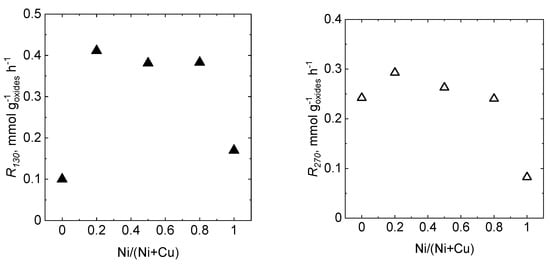 Catalytic activity of granular catalysts expressed as specific reaction rate R130 in the oxidation of ethanol (left), and specific reaction rate R270 in the oxidation of toluene (right) in dependence on Ni/(Ni + Cu) molar ratio.