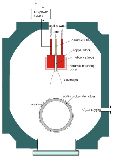 Scheme of the hollow cathode sputtering system used for the active phase deposition on the stainless steel meshes.