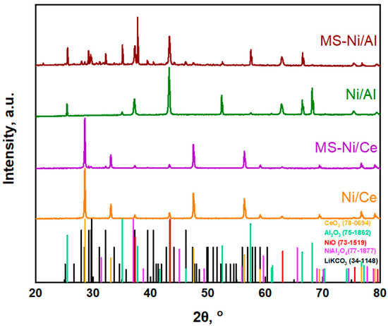 Figure 1 shows the XRD patterns of Ni/CeO2, Ni/Al2O3 and their blends with the binary carbonate salt mixture. All catalysts exhibited the characteristic peaks of cubic NiO at 2θ angles of ca. 37, 43, 63, 76, and 79.5° (PDF #73-1519). No characteristic peaks of precursor Ni(NO3)3 or of other nitrates were detected, indicating that nickel nitrate was totally utilized and decomposed during the catalysts’ preparation procedure. Furthermore, the d-spacing (d) values of as-prepared catalysts, calculated by Bragg’s law, along with the corresponding lattice parameters (α), are summarized in Table 1. In addition, by applying the Scherrer equation [89], the primary crystallite sizes (DXRD) of ceria and alumina were found to be 54.92 and 73.22 nm, respectively (Table 1). Moreover, the crystallite size (DXRD) of the NiO particles on both the alumina and ceria supports was calculated at ca. 40 nm (37.22 and 42.83, respectively, in Table 1), in accordance with HR-SEM observations (Section 2.2). Both MS-Ni catalysts exhibited characteristic peaks at 2θ angles of 28–35, 40, and 47°, which are attributed to Li2CO3-K2CO3 carbonates (Figure 1).