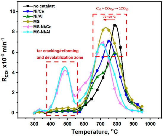 Figure 5 and Figure 6 depict the instant CO production rate, RCO (min−1), and carbon to CO conversion efficiency, Xco, as a function of temperature during the batch non-isothermal CO2 catalytic gasification tests over the different catalytic systems examined (Ni/CeO2, Ni/Al2O3, MS, and MS-Ni systems). For comparison purposes, the catalyst-free gasification experiments are also included. The CO2 gasification process includes two consecutive steps (Table 3): the volatile decomposition and tar cracking/reforming reactions (R1-R6,) in the temperature range of 300–600 °C (step 1), and the reaction of the remaining char with CO2 (R9) along with other solid and/or gas-phase reactions (R7, R8), denoted as step 2 [36].