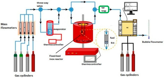 Figure 9 schematically illustrates the experimental setup for the olive kernel catalytic gasification tests, which were performed under a batch mode of operation. The experimental apparatus and conditions are described in detail in our previous work [31]. In brief, a mixture of fuel feedstock (0.1 g) and MS or MS-Ni catalyst was loaded into an Inox, U-tube, fixed bed reactor. The employed catalyst-to-biomass weight ratio was fixed at 0.5:1 for the MS-OK experiments, 2.5:1 for the Ni-aided gasification tests, and 0.5:2:1 for the ternary MS-Ni catalyst/OK mixtures. The mass ratio of the employed catalysts to OK was fixed at 2.5, while the MS to OK weight ratio was set at 0.5. The feedstock mixtures were prepared by physically mixing the olive kernel with the examined catalyst composites in an agate mortar. The flowrate of 20 vol.% CO2/He, used as gasifying agent mixture, was set at 30 cm3/min. After passing through a cooling trap (ice bath) to collect tars, the gaseous products were driven to a gas chromatograph (Shimadzu GC-14B) to monitor the effluent’s gas composition in the temperature range of 300–950 °C, by increasing the temperature at a constant rate of 2 °C/min. In order to obtain reliable and accurate results, all gasification tests were repeated at least twice.