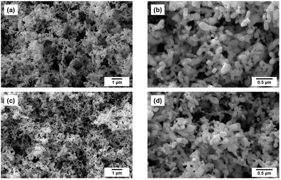 The morphology and secondary structure of the resulting alloys studied by SEM are demonstrated in Figure 2. According to the presented microscopic data, the Pt1−xNix samples have a characteristic porous structure, which is represented by irregularly shaped primary grains 100–150 nm in size. Primary particles are accreted with each other and connected by bridges of 75–100 nm in size (Figure 2a,c,e), thus forming a single spongy structure of the alloy. At the same time, certain differences can be noted for samples with a high content of Ni (more than 50 at.%). During reductive thermolysis, sintering of the particles with increased nickel content proceeds faster due to the higher diffusion rate of Ni atoms and is less refractory if compared to platinum. As a result, a porous structure built of primary particles of a larger size (up to 200 nm) is formed (Figure 2a–d). It should be emphasized that the observed morphology is typical for porous alloys obtained by the thermolysis of precursors [47,48]. Note that the specific surface area (SSA) of the initial microdispersed alloys is averaged to be ~10 m2/g.