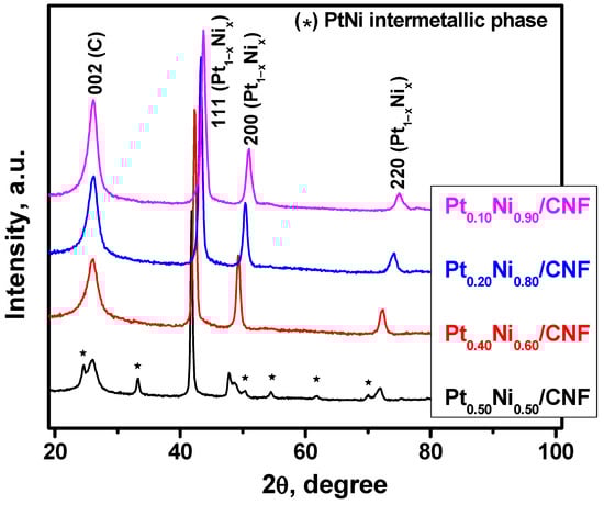 XRD patterns of Pt1−xNix/CNF composites synthesized via ethylene decomposition over the respective alloys. Asterisks (*) show the superstructural reflections of the PtNi intermetallic phase.