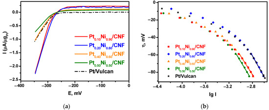 The catalytic activity of Pt1−xNix/CNF composites in electrochemical hydrogen evolution reaction (HER): (a) linear potential sweep in 0.1 M H2SO4 at a sweep rate of 10 mV/s; (b) Tafel dependences of hydrogen evolution processes.