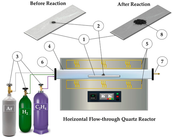 Scheme of the experimental setup used for the synthesis of Pt1−xNix/CNF composites: 1—quartz plate; 2—sample of Pt1−xNix alloy; 3—gas vessels; 4—tubular quartz reactor; 5—heating elements; 6—input of the reaction mixture (C2H4/H2/Ar); 7—output of reaction gases; 8—resulting Pt1-xNix/CNF composite.