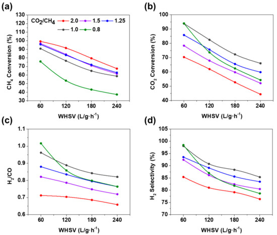 26]. However, there is not enough research that comprehensively compares the effect of operating parameters in the dry-reforming process, focusing on the feed gas composition and side reactions. It is still difficult to systematically investigate the catalytic activity, coke formation and reaction behavior according to operating conditions such as temperature, WHSV and gas compositions for the syngas–hydrogen production via practical biogas-linked DRM reactors. The optimal conditions for maximizing syngas yield and minimizing coking must be also figured out, since purified biogas can intrinsically contain CH