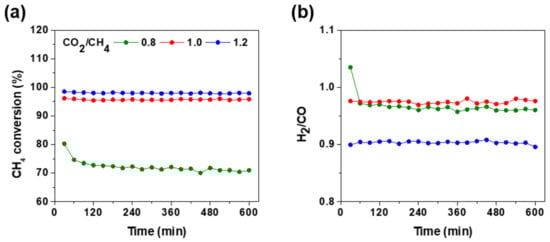 To evaluate the stability and durability of Ni catalysts in the DRM system, we conducted long-term activity tests at 850 °C for 600 min with different feed ratios (