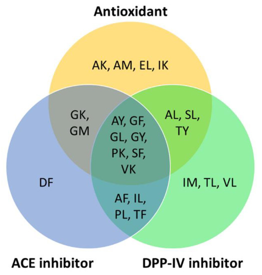 Fourteen of the 25 peptide sequences (AF, AY, DF, GF, GK, GL, GM, GY, IL, PK, PL, SF, TF, and VK) were previously shown to exhibit anti-ACE activity [53,54,55,56,57,58,59,60]. Four of the anti-ACE peptides were previously identified in edible plant sources, corn gluten meal (AY) [56], garlic (SF) [55], wheat milling byproducts and rapeseed (TF) [14,53], and Tartary buckwheat (VK) [57], respectively. On the other hand, 17 peptide sequences (AF, AL, AY, GF, GL, GY, IL, IM, PK, PL, SF, SL, TF, TL, TY, VK, and VL) were previously demonstrated to have anti-DPP-IV activity [61,62,63] (Figure 3). Many of the 25 abundant, high-GI-absorption, non-toxic dipeptides have multi-functionality. Nine of the dipeptides are bifunctional, having both antioxidant and anti-ACE activities. Ten of the dipeptides have both antioxidant and anti-DPP-IV activities. Eleven of the dipeptides have both anti-ACE and anti-DPP-IV activities. Notably, seven of the peptides are trifunctional, having antioxidant, anti-ACE, and anti-DPP-IV activities (Figure 3). Besides the aforementioned major bioactivities, four other bioactivities were found in a small number of the 25 peptides, DPP-III inhibitor (GF and TF) [64,65], renin inhibitor (SF and TF) [14,66], stimulator of glucose uptake (IL and VL) [67], and regulator of phosphoglycerate kinase activity (SL) [68].