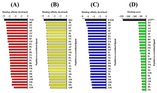Binding affinities of 25 peptides complexed with (A) MPO, (B) XO, and (C) Keap1, in comparison with the co-crystallized ligand of each target protein. Docking scores of 25 peptides complexed with p47phox in comparison with the co-crystallized ligand (D). For (A), 7GD is 7-benzyl-1H-[1,2,3]triazolo [4,5-b]pyridin-5-amine, the co-crystallized inhibitor of MPO. For (B), Que is quercetin, the co-crystallized inhibitor of XO. For (C), ETGE is the key motif of the Nrf2 peptide co-crystallized with Keap1. For (D), p22phox represents the co-crystalized p22phox-derived proline-rich peptide (GPLGSKQPPSNPPPRPPAEARKKPS).