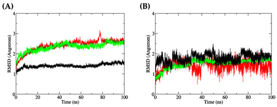 (A) all-atom RMSD of receptor proteins (red: MPO; green: XO; black: Keap1); (B) all-atom RMSD of dipeptide ligands bound to the receptor proteins (red: DF (bound to MPO); green: TF (bound to XO); black: DF (bound to Keap1)).