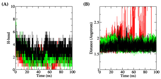 (A) Number of intermolecular (protein–peptide) hydrogen bonds (red: MPO; green: XO; black: Keap1); (B) Minimum distance between each protein and its dipeptide ligand (red: DF, bound to MPO; green: TF, bound to XO; black: DF, bound to Keap1).