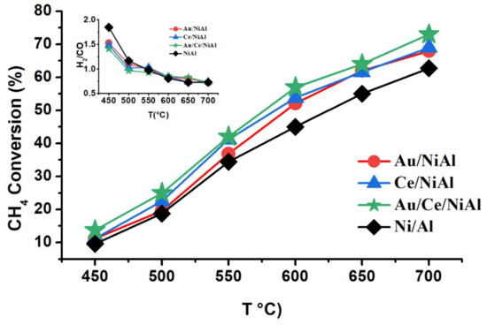 competing with the DRM reaction [33,34]. However, the opposite effect of CH4 conversions larger than the CO2 conversions was reported with some Ce-promoted hydrotalcite-derived catalysts, attributed to the preferential occurrence of a CH4 decomposition reaction [24]. Different experimental conditions, such as gas feed dilution or space velocity, might explain the discrepancy between the results. The H2/CO molecular ratios, plotted as a function of temperature, are shown in the inset of Figure 1. The ratio decreased with temperature, ranging from values above 1.5 to a stable 0.7 for temperatures above 600 °C, passing through the stoichiometric value of 1 at 550 °C. The changes of the H2/CO ratio and the discrepancy between CH4 and CO2 conversions with temperature were intrinsically related to the side reactions taking place during the DRM test, particularly CH4 decomposition and RWGS, depending differently on the temperatures [15,33]. Generally, a H2/CO ratio less than one is due to an excess of CO, which may imply less coke deposition [9,35]. The largest H2/CO ratio obtained at low temperatures with the unpromoted NiAl catalyst was also in accordance with its superior activity in WGSR tested at temperatures up to 300 °C, as reported in the previous study [32].