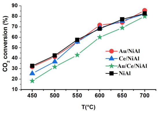 The CH4 and CO2 conversions obtained with the different catalysts, plotted as a function of temperature in the temperature range of 450–700 °C, are shown in Figure 1 and Figure 2, respectively.