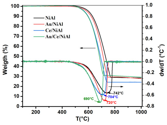 At the beginning of the curves, a slight increase in the weight due to the oxidation of nickel was registered in a temperature range of 200–400 °C. Such an increase, equal for all samples, was hardly detectable, being much smaller compared to the large weight losses due to the carbon combustion. The carbon loss occurred within the wide temperature range of 500–750 °C, which corresponded to the reactivity of different types of carbon [14,27]. According to the profiles of Figure 4 and the calculated percentages of deposited carbon listed in Table 2, a similar amount of carbon formed upon DRM reaction with the unpromoted and promoted samples, except for the Ce-promoted one, which exhibited more carbon formation. Increased carbon deposition for Ce-doped samples was reported on similar types of catalysts and the weight loss observed at temperatures above 600 °C was attributed to graphitic carbon combustion [36]. The first derivative curves (DTG) allowed the pinpointing of the temperatures of the maximum loss, which are also reported in Table 2. Downward temperature shifts of 38 °C for the Ce/NiAl, 22 °C for the Au/NiAl and 52 °C for the Au/Ce/NiAl were observed in comparison to the unpromoted NiAl. The decrease in the temperature confirmed a positive effect exerted by both promoters, favoring the formation of an easier-to-remove carbon [36].