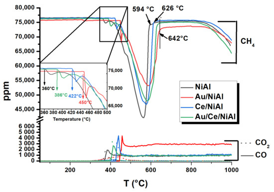 As reported in the literature, the temperature window for TPSR-CH4 activity, corresponding to Tdec in Table 3, is indicative of the anti-coking ability in DRM [21,38]. Therefore, according to the Tdec values, the Au/Ce/NiAl catalyst should have the best anti-coking aptitude during the dry reforming process in accordance with the TGA results in Table 2 [38]. Simultaneously to the methane decomposition, there is a small but continuous production of CO arising from the reaction of the carbon, stemming from CH4 dissociation and diffusing through the nickel particles, with the oxygen of the sample lattice [37]. The methane conversion taking place above 800 °C was due to the homogeneous thermal decomposition of CH4 [39].