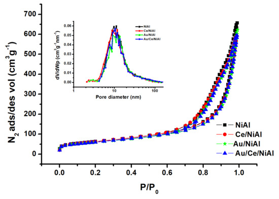 In Table 1, along with the elemental composition, the BET-specific surface areas and the pore volumes of the calcined HT-derived samples are listed. The particle sizes of NiO, Au and Ni as derived from the XRD analyses to be discussed later, are also included. The N2 adsorption–desorption isotherms are plotted in Figure 6, with the pore size distributions given in the inset.
