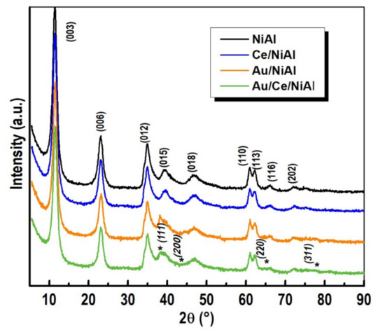 The structure of the parental NiAl hydrotalcites was confirmed by the X-ray diffraction patterns displayed in Figure 7, where all the reflections typical of the layered structure of takovite mineral and those of metallic gold are indicated [32].