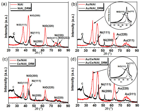 The X-ray diffraction patterns of the catalysts, which were calcined at 600 °C, changed considerably. The diffractograms of these catalysts before and after the catalytic tests are given in Figure 8. As expected, after calcination, the takovite structure disappeared, and instead each sample before reaction exhibited a pattern characterized by the reflections at 2θ = 37.2°, 43.3°, 62.9°, 75.4° and 79.4° indexed as (111), (200), (220), (311) and (222) crystalline planes of cubic NiO (JCDD-PDF File 00-047-1049) [42]. No peaks related to the spinel NiAl2O4 were detected. Due to the low amount of ceria, no ceria-related reflections were present in the patterns of the samples containing 1 wt% Ce. By contrast, the patterns of the samples with 3 wt% Au contained peaks at 2θ = 38.2° and 64.6° very close to the NiO reflections, and a peak at 2θ = 77.5°, attributed respectively to the (111), (220) and (311) crystalline planes of the cubic Au (JCDD-PDF File 00-004-0784). Deconvolution of the NiO (111) and Au (111) peaks is shown as a zoomed-in region in the insets of Figure 8.