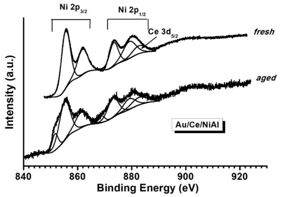 XPS measurements of the fresh (calcined) catalysts were carried out to investigate the distribution and the chemical state of each catalyst component. The Ni 2p spectra of all the catalysts were typical of Ni2+, characterized by the main Ni 2p3/2 and Ni 2p1/2 spin-orbit components, each accompanied by the shakeup features [44]. As an example, the Ni 2p spectra of the Au/Ce/NiAl catalyst before (fresh) and after the DRM reaction (aged) are given in Figure 10.